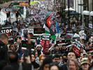British police estimated that up to 100,000 marchers participated. The crowds, carrying Palestinian flags, also demanded that Israel discontinue deadly airstrikes in the enclave.